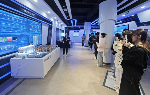 在湖州联通公司,同学们依次参观了智慧5G、云计算、物联网、未来工厂及智慧社区等展厅模块,系统了解了联通在5G通信、人工智能等领域的创新成果与应用实践。